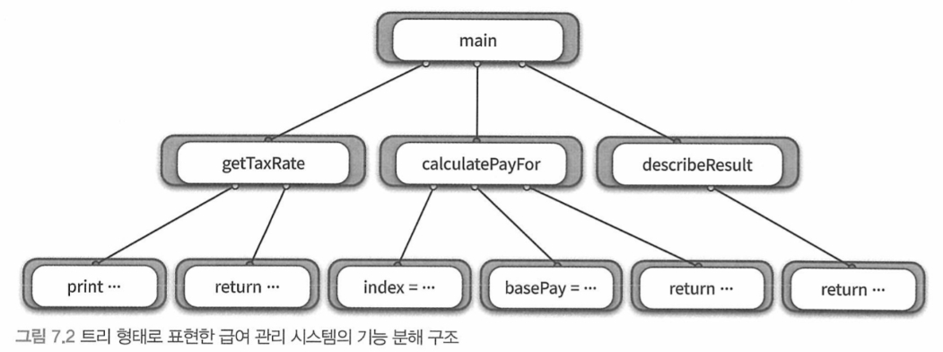 하향식으로 기능을 분해하는 과정은 하나의 함수를 더 작은 함수로 분해하고, 분해된 함수들의 실행 순서를 결정하는 작업으로 요약할 수 있다. 이것은 설계를 시작하는 시점부터 시스템이 무엇(what)을 해야 하는지가 아니라 어떻게(how) 동작해야 하는지에 집중하도록 만든다.