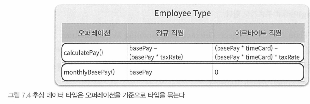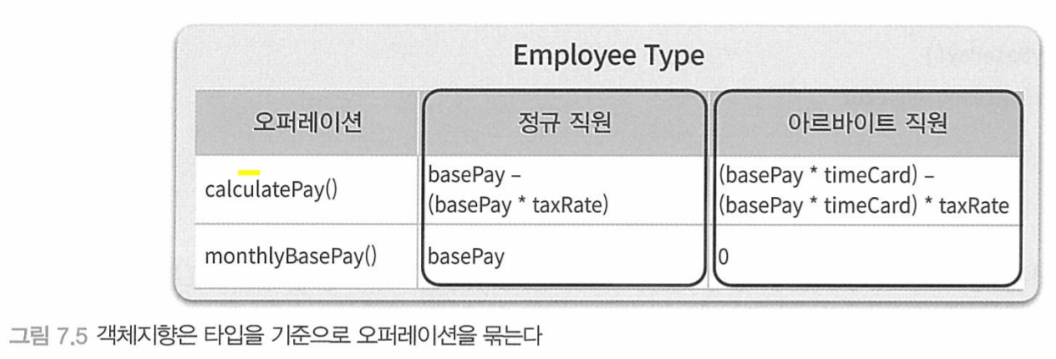 추상 데이터 타입이 오퍼레이션을 기준으로 타입을 묶는 방법이라면 객체지향은 타입을 기준으로 오퍼레이션을 묶는다. 즉, 정규 직원과 아르바이트 직원이라는 두 개의 타입을 명시적으로 정의하고 두 직원 유형과 관련된 오퍼레이션의 실행 절차를 두 타입에 분배한다.